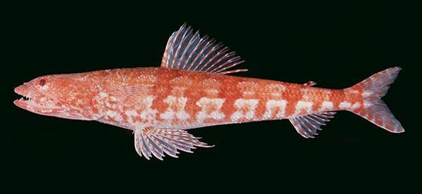 型態特徵:體圓而瘦長,呈長圓柱形,尾柄兩側具稜脊。頭較短。吻圓,吻長明顯大於眼徑。前鼻孔瓣長且圓。眼中等大;脂性眼瞼發達。口裂大,上頜骨末端遠延伸至眼後方;頜骨具銳利之小齒;顎骨前方齒較後方齒長,明顯自成一叢。體被圓鱗,頭後背部、鰓蓋和頰部皆被鱗;側線鱗數55-58;側線上鱗數3.5(少數為4.5)。單一背鰭,具軟條13-15(通常為14);有脂鰭;臀鰭與脂鰭相對,具軟條8-9(通常為8);胸鰭長,末端延伸至腹鰭起點與背鰭起點之連線;尾鰭叉形,上葉等長於下葉。體紅色,體側具不規則之深紅色帶和斑點,最大斑紋的中央有時為黃色;吻背上不具一對小而顯著的黑點;各鰭皆具斑點,並連成橫向斑紋。 棲所生態:主要棲息於沿近海靠近礁石之砂泥底質海域。屬肉食性,以小型魚類及甲殼類為主。通常在砂地上停滯不動,身上的花紋是很好的偽裝,有時會將整個身體埋入砂中而只露出眼睛,等候獵物游經時,躍起吞食。 地理分佈:分佈於印度-太平洋區,西起非洲東部,東至夏威夷,北至日本,南至澳洲及紐西蘭等。台灣分佈於南部海域。 漁業利用:偶為底拖網或延繩釣捕獲,可食用。 |