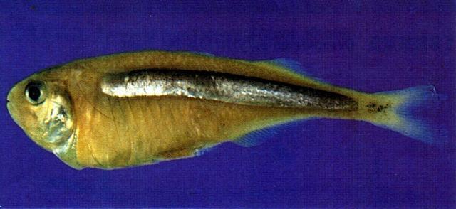 | 型態特徵:體延長,強度側扁;體高在胸鰭基部附近為最大,體高為頭長之1.4-1.5倍;胸部下緣薄如刀狀,腹部正中線有肉質隆起稜。頭短鈍。口小,斜位;上頜不能伸出;上下頜具齒。擬鰓存在;第一鰓弓下枝鰓耙9-14。體被小圓鱗,頭部、胸部及腹部無鱗;中央側列鱗數42-55。第一背鰭小,具弱棘III-IV,第二背鰭與臀鰭對在,但較後者為小,具I棘,10-17軟條;臀鰭具I棘,20-28軟條;胸鰭高位,其後緣圓形;尾鰭開叉。體略呈透明,體側自胸鰭基部至尾鰭基部有寬銀色縱走帶。 棲所生態:主要棲息於沿岸碎浪區。生命較脆弱,釣獲上岸後難以存活。 地理分佈:分佈於西太平洋區水域,包括澳洲及臺灣等。台灣主要分佈於南部沿海。 漁業利用:較罕見魚種,無經濟價值。 |