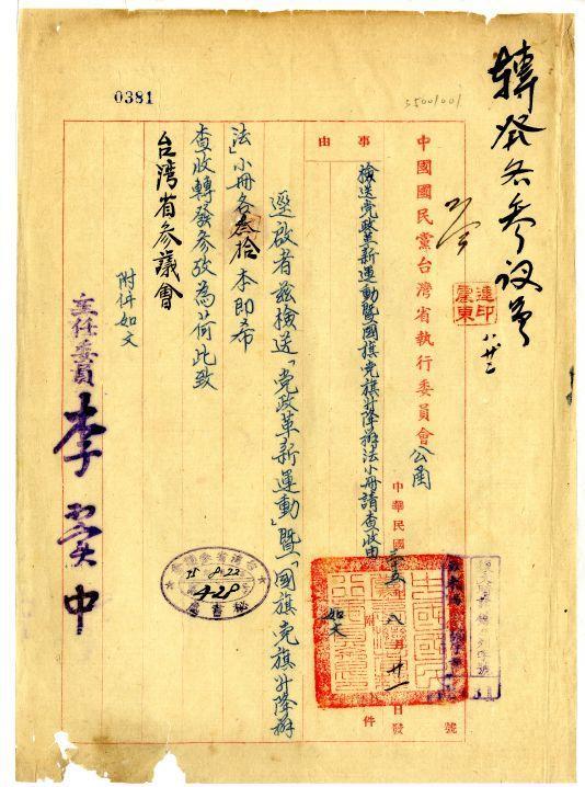 資源導覽:中國國民黨台灣省執行委員會函送黨政革新運動暨國旗黨旗升降辦法三十冊分送省參會各參議員之函件。 | 中央研究院數位典藏資源網