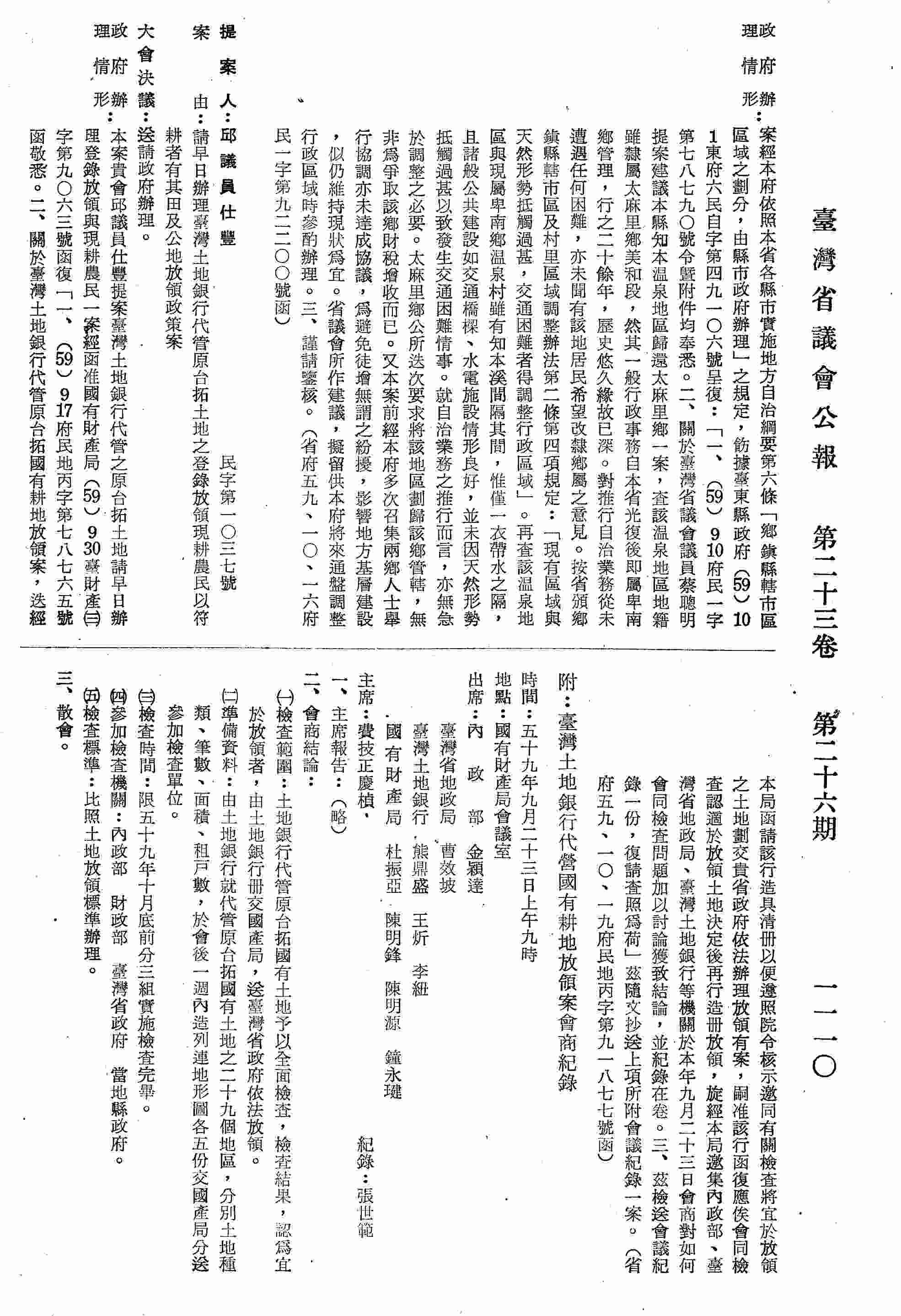 請早日辦理臺灣土地銀行代管原臺拓土地之登錄放領現耕農民以符耕者有其田及公地放領政策案。〔省府五九、一○、一九府民地丙字第九一八七七號函復〕