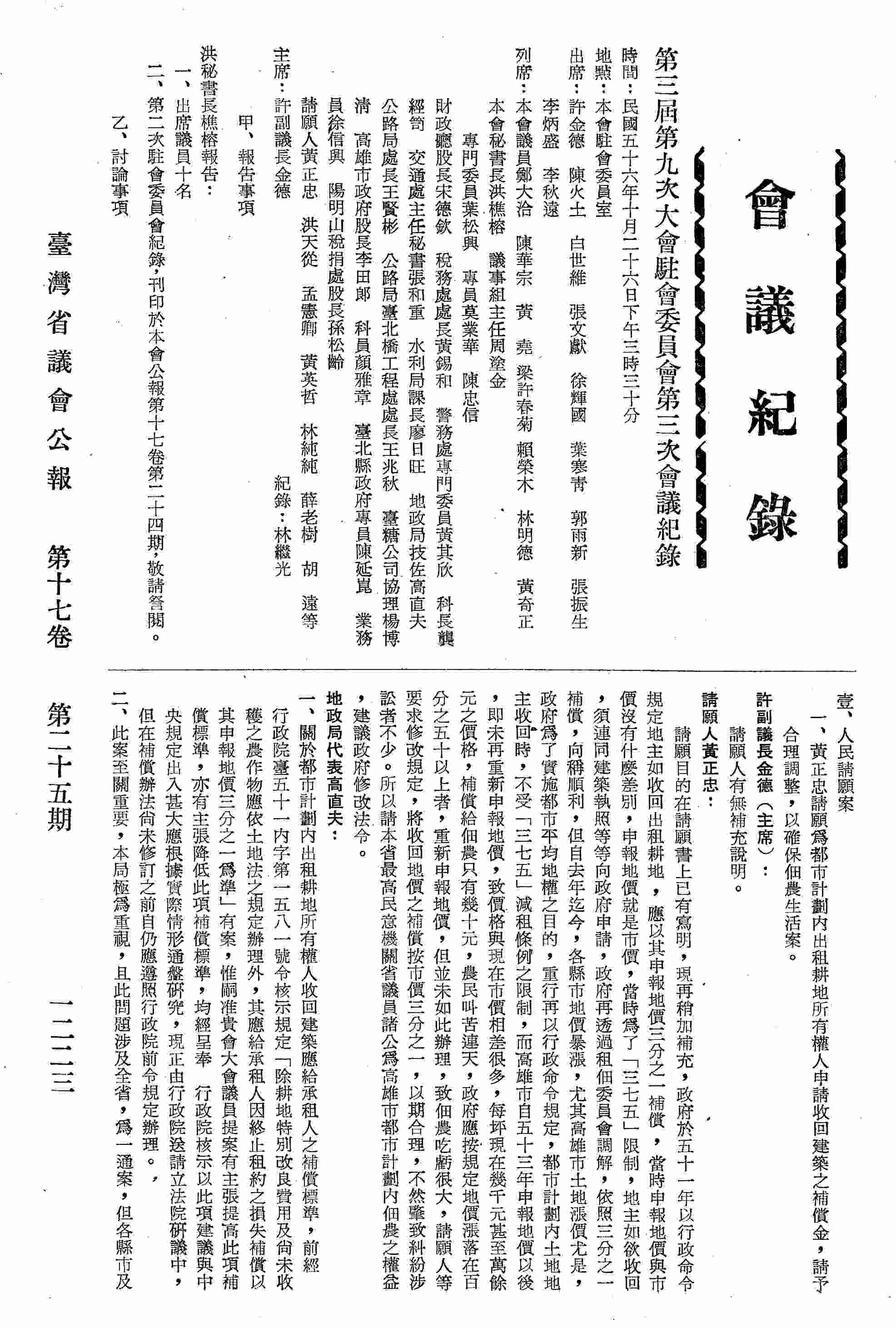 第三屆第九次大會駐會委員會第三次會議紀錄:甲、報告事項;乙、討論事項:壹、人民請願案:一、黃正忠請願為都市計劃內出租耕地所有權人申請收回建築之補償金,請予合理調整,以確保佃農生活案;二、洪天從等請願為請顧及貧困人民居住問題,准將高雄市忠孝段四小段一-一一號省有公地依照一般處理辦法租與民等繼續使用免予執行拆遷俾蘇民困案;三、孟憲卿等請願為請放寬特種營業限制准由酒店業者變更申請登記為酒吧以應事實需要案;四、臺灣省旅?商業同業公會聯合會理事長黃英哲請願為全省旅館業奉令每月申報服務生小費所得困難重重敬懇體察實情轉請省府收回原令或暫緩實施以蘇商艱案;五、林純純請願為本公司所產製之「地球牌濃縮天然果汁」貨物稅核定過高無力繳納懇請財政廳准予免除補繳並維持原級完稅標準以恤商艱案;六、薛老樹請願為臺南縣新化鎮拔林溪公共給水水權取得登記一案建議臺糖公司體卹民艱無條件讓步以解決人民飲水問題案;七、胡遠等請願為政府拓建臺北大橋征用民地拆除民房案應顧及民生合理補償以重人民權益案;貳、臨時動議案:一、議員陳火土、議員郭雨新兩議員動議為建議政府對宜蘭縣十月十七日水災救濟,災後重建,請比照八七水災成例,由省府提出專款,迅予辦理,以蘇災黎案;二、議員張振生動議為建議政府對於基隆市此次(十月十七日)遭受解拉颱風之豪雨災害損失造成崩山七十六處,致傷亡及倒屋等之損失嚴重,請比照八七水災援例由省政府劃撥專款迅予辦理,以蘇災黎由;丙、省府提議案:一、臺灣省政府函為擬先墊款辦理龜山、烏來段道路改善工程一案請查照惠予同意見復由;二、臺灣省政府函為油羅溪橋及秀朗橋新建工程擬墊款先辦一案,函請查照惠予同意見復案。