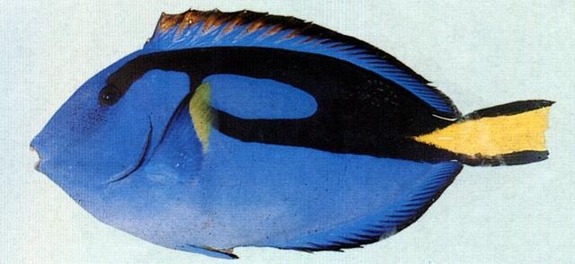 中文名:擬刺尾鯛 學名:Paracanthurus hepatus 台灣俗名:藍倒吊、剝皮魚 大陸名:黃尾副刺尾魚