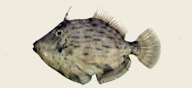 | 型態特徵:體高而呈菱形;頭高大於頭長。吻上緣線稍凹。口端位。鰓孔位於眼後半部或後緣下方,與體中線呈58至68度夾角。體鱗粗糙,每一鱗片只具一中央強棘,此棘有一粗柄,棘頂大量分叉,伸出許多小枝,成一冠叢狀,尾柄鱗片小棘延長成細剛毛。第I背鰭棘位在眼後緣的上方,背棘中庸,棘後緣有小棘;雄魚背鰭第一鰭條延長成絲狀;腹鰭膜小,向後延長稍越過恥骨末端特化鱗;特化鱗三對,短,粗壯,可活動,第一對與第三對約等長。體灰或灰綠色,具許多水平細黑紋,夾雜許多小黑點。背鰭,臀鰭灰褐色,尾鰭色較深,具二條弧形紋。 棲所生態:近海底層魚類,喜聚集生活。肉食性魚類,主要以小型甲殼類、貝類及海膽等為食。 地理分佈:分佈於西太平洋區,由日本至東中國海及台灣。台灣除小琉球、綠島及蘭嶼外均有分佈。 漁業利用:中小型魚類,通常以底拖或一支釣捕獲,肉質佳,適宜煮湯食之。日本已有人工養殖,經濟價值高。 |