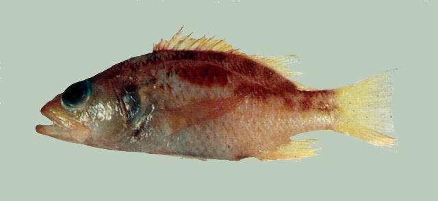 型態特徵:體長橢圓形,側扁而略高,標準體長為體高之2.8-3.0倍。頭背部略為弧形;眶間區平坦。眼稍大,長於或等於吻長。口大;上下頜前端具小犬齒。鰓耙數5-6+10-11,隨成長而漸退化。前鰓蓋骨下緣具二枚前向棘。體被細小櫛鱗,主上頜骨及頤部無鱗;側線完整,側線鱗孔數30-35,側線上鱗列數3。背鰭鰭棘部與軟條部相連,具缺刻,具硬棘X,軟條16-18,第IV或V棘最長;臀鰭硬棘III枚,軟條7;腹鰭腹位,末端延伸不及肛門開口;胸鰭延長,中央之鰭條長於上下方之鰭條,鰭條 14-15,部份鰭條有分支;尾鰭內凹形。體淡粉紅色,體側沿著側線上下各具一列暗紅色班塊,上列有8個,下列有5個。以前所記載之中州花鱸(Plectranthias chungchowensis)為本種之同種異名。 棲所生態:主要棲息於較深水域的巖礁區或砂石區。底棲性。內食性,以小型魚類及甲殼類為食。 地理分佈:分佈於西太平洋區,包括阿拉夫拉海、印尼的Kai島及台灣等。台灣南部及西部海域有產。 漁業利用:小型花鱸,不具經濟性之魚種。偶以延繩釣或一支釣等捕獲。不具食用價值。 |